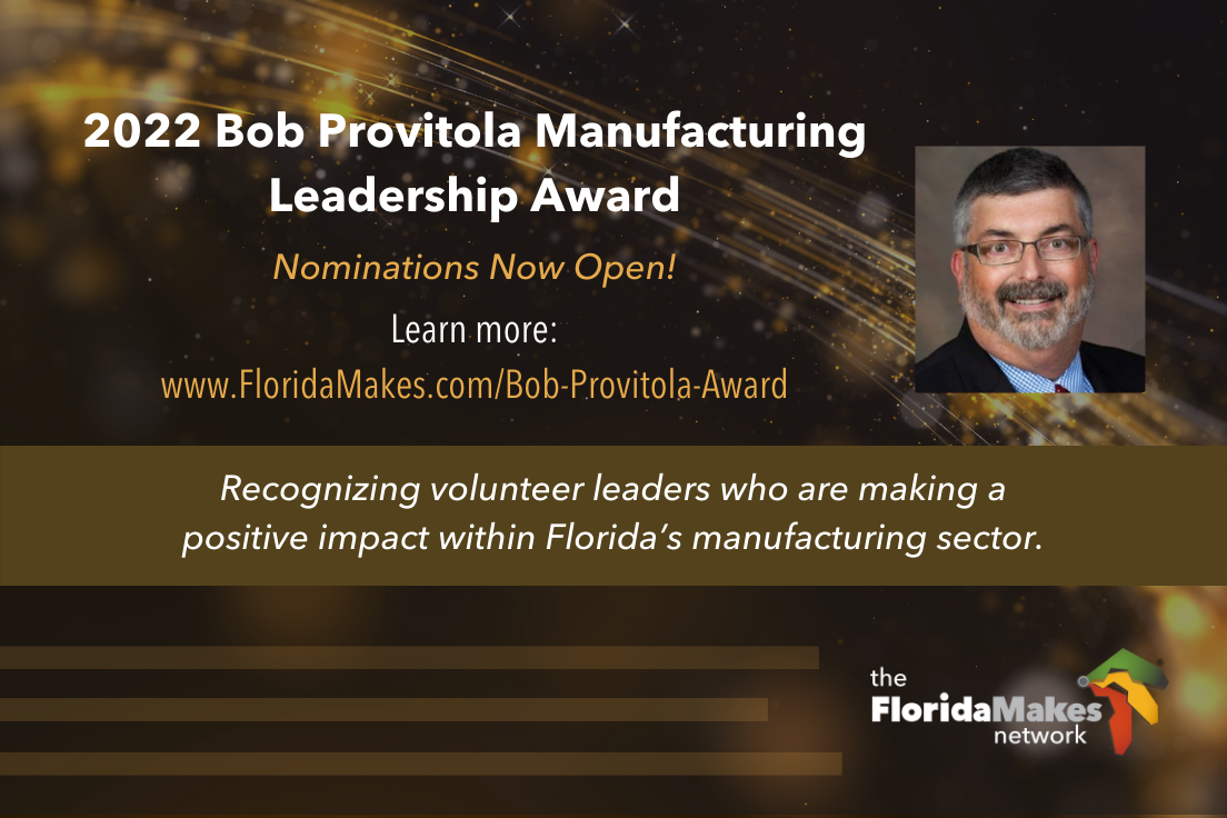 Not only was Bob’s leadership, fortitude, and commitment to excellence instrumental to the creation of the FloridaMakes Network, he made a huge, positive impact within Florida’s manufacturing community and its workforce,” said Kevin Carr, FloridaMakes Network CEO. “We’re happy that this award continues to highlight Bob’s legacy by recognizing other leaders from across Florida who, like Bob, have made significant contributions to manufacturing in Florida.