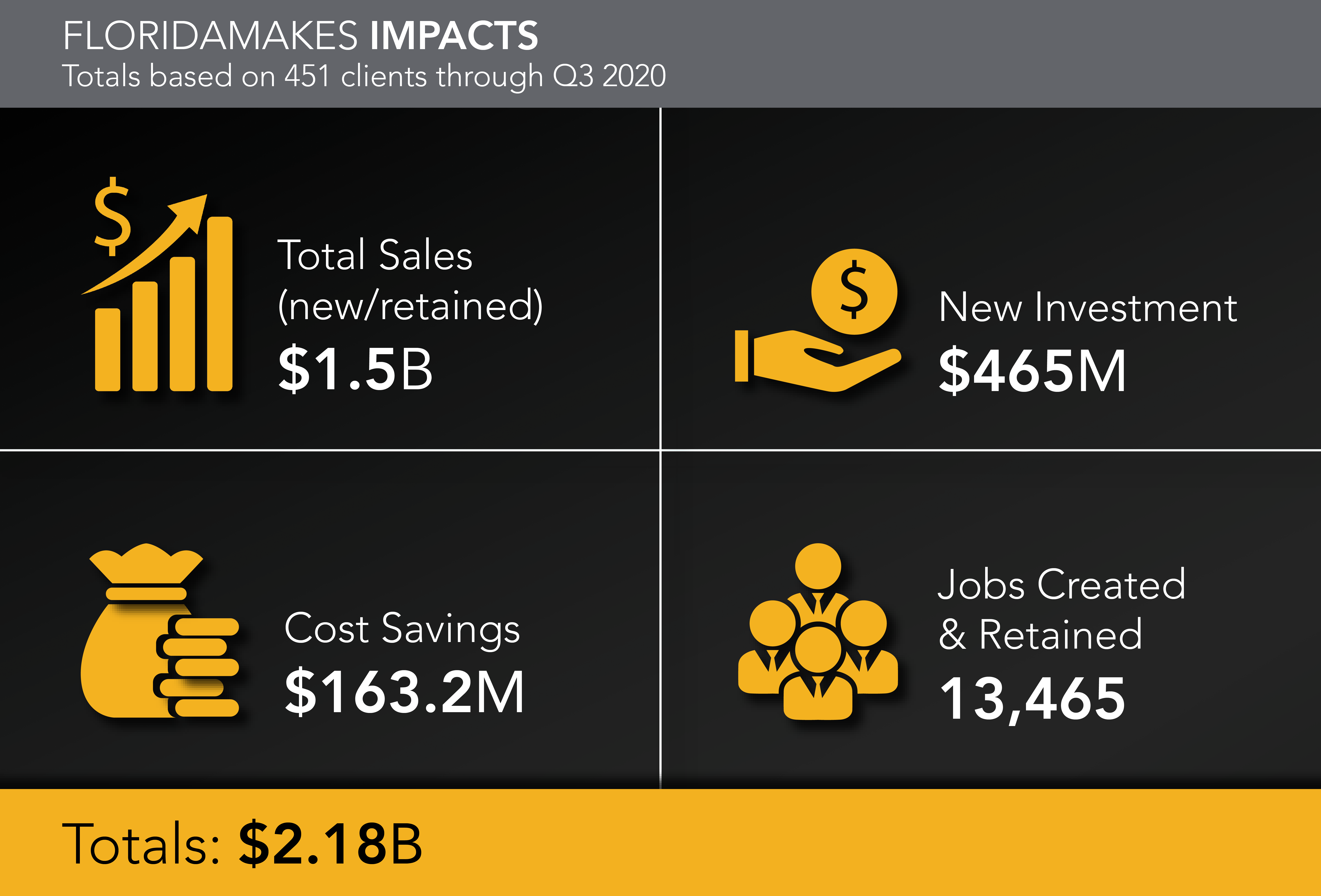 We’re excited to report that Florida manufacturers who received services through the FloridaMakes Network have reported a combined total of $2.18 billion in measurable impacts (total survey data through Q3, 2020). The results include: