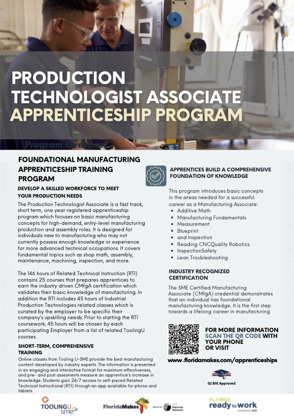 Basic manufacturing concepts with fundamental topics such as shop math, assembly, maintenance, machining, inspection, and more. During the training period, apprentices follow a structured training plan that allows them to master occupational skills in the context of an employer’s organization and access theoretical content on demand through ToolingU-Sme's online Learning Management System. The 146 hours of Related Technical Instruction (RTI) contains 25 courses that prepares apprentices to earn the industry driven CMfgA certification which validates their basic knowledge of manufacturing.